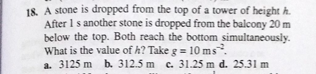 A stone is dropped from the top of a tower of height h. After 1 s another stone is dropped from the balcony 20 m below the top. Both reach the bottom simultaneously. What is the value of h ? A stone is dropped from the top of a tower of height h. After 1 s another stone is dropped from the balcony 20 m below the top. Both reach the bottom simultaneously. What is the value of h ? September 19, 2020 Category: Uncategorised (JEE Advanced Physics by BM Sharma + GMP Solutions) , Facebook Messenger WhatsApp Share this:TwitterFacebook Related
