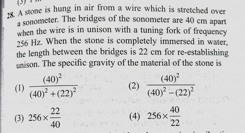 A stone is hung in air from a wire which is stretched over a sonometer. The bridges of the sonometer are 40 cm apart when the wire is in unison with a tuning fork of frequency 256 Hz. A stone is hung in air from a wire which is stretched over a sonometer. The bridges of the sonometer are 40 cm apart when the wire is in unison with a tuning fork of frequency 256 Hz. November 6, 2020 Category: Uncategorised (JEE Advanced Physics by BM Sharma + GMP Solutions) , Facebook Messenger WhatsApp Share this:TwitterFacebook Related