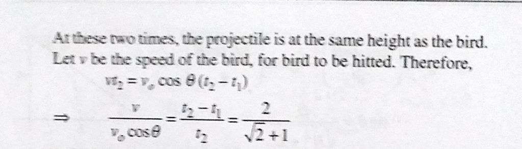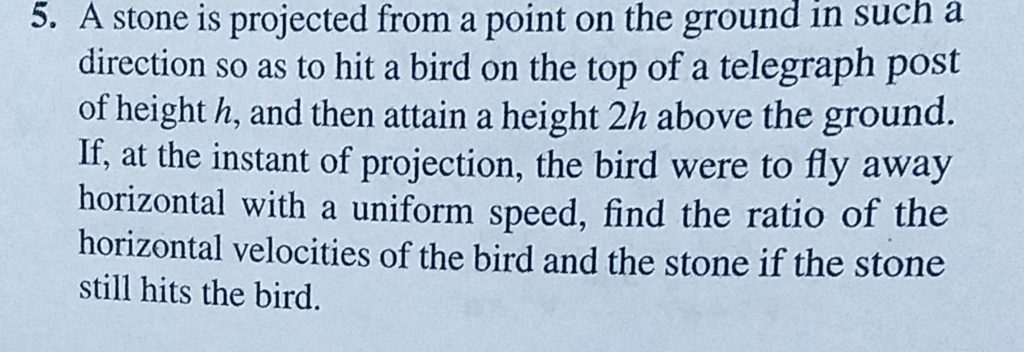 A stone is projected from a point on the ground in such a direction so as to hit a bird on the top of a telegraph post of height h, and then attain a height 2 h above the ground. If, at the instant of projection, the bird were to fly away horizontal with a uniform speed, find the ratio of the horizontal velocities of the bird and the stone if the stone still hits the bird.