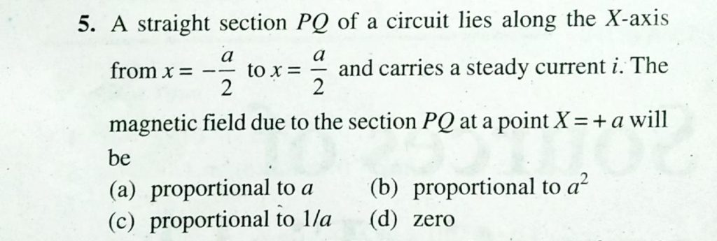A straight section PQ of a circuit lies along the x–axis from x = – to x = and carries a current I. The magnetic field due to the section PQ at point x = + a will be A straight section PQ of a circuit lies along the x–axis from x = – to x = and carries a current I. The magnetic field due to the section PQ at point x = + a will be September 9, 2020 Category: Uncategorised (JEE Advanced Physics by BM Sharma + GMP Solutions) , Facebook Messenger WhatsApp Share this:TwitterFacebook Related