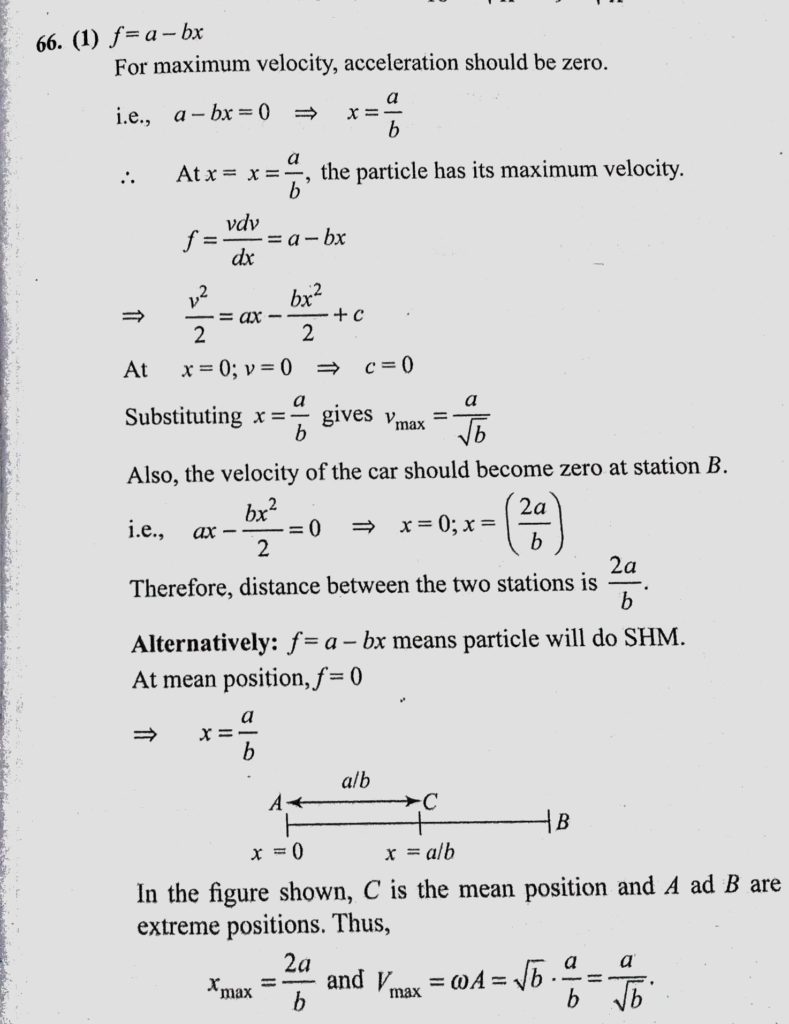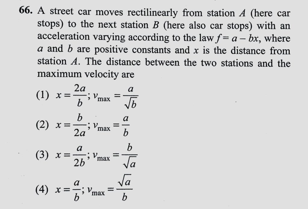 A street car moves rectilinearly from station A (here car stops) to the next station B (here also car stops) with an acceleration varying according to the law f = a – bx, where a and b A street car moves rectilinearly from station A (here car stops) to the next station B (here also car stops) with an acceleration varying according to the law f = a - bx where a and b October 31, 2020 Category: Uncategorised (JEE Advanced Physics by BM Sharma + GMP Solutions) , Facebook Messenger WhatsApp Share this:TwitterFacebook Related