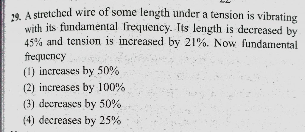 A stretched wire of some length under a tension is vibrating with its fundamental frequency. Its length is decreased by 45% and tension is increased by 21%. Now fundamental frequency A stretched wire of some length under a tension is vibrating with its fundamental frequency. Its length is decreased by 45% and tension is increased by 21%. Now fundamental frequency November 6, 2020 Category: Uncategorised (JEE Advanced Physics by BM Sharma + GMP Solutions) , Facebook Messenger WhatsApp Share this:TwitterFacebook Related