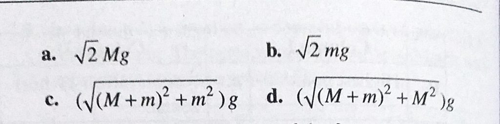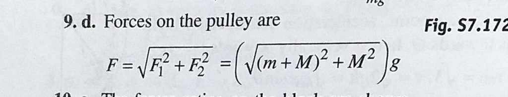 A string of neglible mass going over a clamped pulley of mass m supports a block of M as shown in the Fig. 7.361. The force on the pulley by the clamp is given by A string of neglible mass going over a clamped pulley of mass m supports a block of M as shown in the Fig. 7.361. The force on the pulley by the clamp is given by October 2, 2020 Category: Uncategorised (JEE Advanced Physics by BM Sharma + GMP Solutions) , Facebook Messenger WhatsApp Share this:TwitterFacebook Related