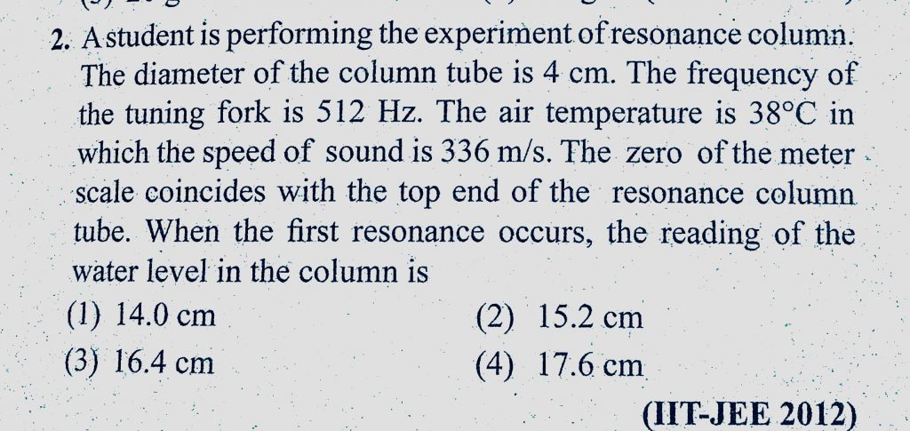 A student is performing the experiment of resonance column. The diameter of the column tube is 4 cm. The frequency of the tuning fork is 512 Hz. The air temperature is 38 C in A student is performing the experiment of resonance column. The diameter of the column tube is 4 cm. The frequency of the tuning fork is 512 Hz. The air temperature is 38 C in November 7, 2020 Category: Uncategorised (JEE Advanced Physics by BM Sharma + GMP Solutions) , Facebook Messenger WhatsApp Share this:TwitterFacebook Related