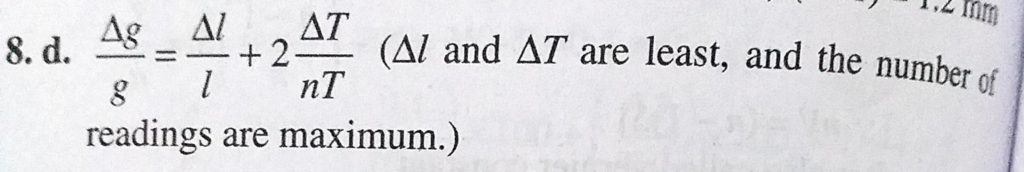 A student performs an experiment for determination of g ( = 4 pie^2 L / T^2 ), L = 1 m, and he commits an error of delta L. For T he takes the time of n oscillations with the stop watch of least count delta T. For which of the following data, the measurement of g will be most accurate?