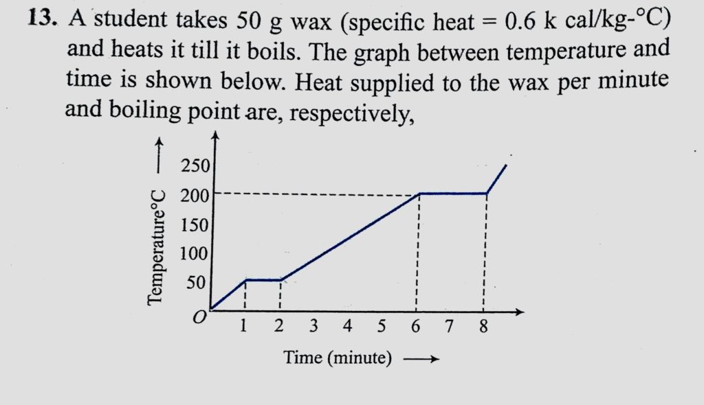 A student takes 50 g wax (specific heat = 0.6 k cal/kg-C) and heats it till it boils. The graph between temperature and time is shown below. Heat supplied to the wax per minute and A student takes 50 g wax (specific heat = 0.6 k cal/kg-C) and heats it till it boils. The graph between temperature and time is shown below. Heat supplied to the wax per minute and October 23, 2020 Category: Uncategorised (JEE Advanced Physics by BM Sharma + GMP Solutions) , Facebook Messenger WhatsApp Share this:TwitterFacebook Related