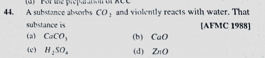 A substance absorbs CO2 and violently reacts with water. That substance is (a) CaCO3 (b) CaO (c) H2SO4 (d) ZnO A substance absorbs CO2 and violently reacts with water. That substance is (a) CaCO3 (b) CaO (c) H2SO4 (d) ZnO November 15, 2020 Category: Uncategorised (JEE Advanced Physics by BM Sharma + GMP Solutions) , Facebook Messenger WhatsApp Share this:TwitterFacebook Related