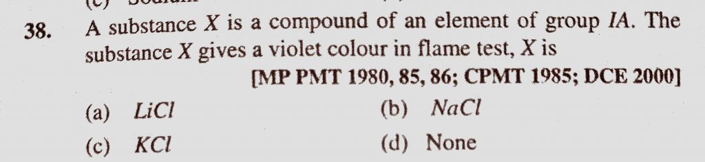 A substance X is compound of an element of group IA. The substance X gives a violet colour in flame test, X is (a) LiCl (b) NaCl (c) KCl (d) None A substance X is compound of an element of group IA. The substance X gives a violet colour in flame test X is (a) LiCl (b) NaCl (c) KCl (d) None November 13, 2020 Category: Uncategorised (JEE Advanced Physics by BM Sharma + GMP Solutions) , Facebook Messenger WhatsApp Share this:TwitterFacebook Related