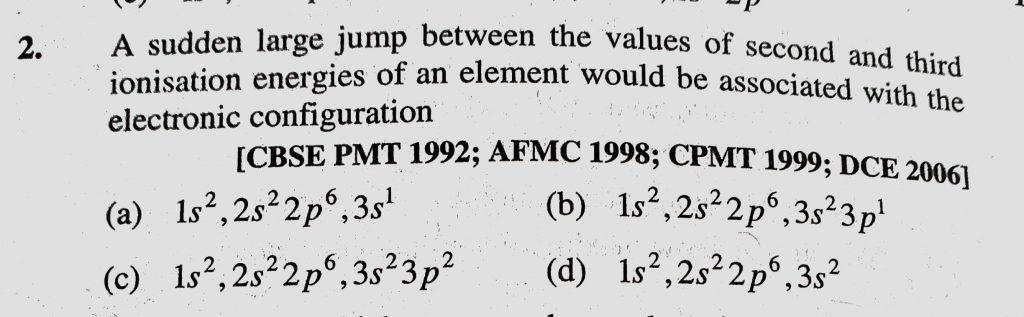 A sudden large jump between the values of second and third ionisation energies of an element would be associated with the electronic configuration A sudden large jump between the values of second and third ionisation energies of an element would be associated with the electronic configuration November 10, 2020 Category: Uncategorised (JEE Advanced Physics by BM Sharma + GMP Solutions) , Facebook Messenger WhatsApp Share this:TwitterFacebook Related