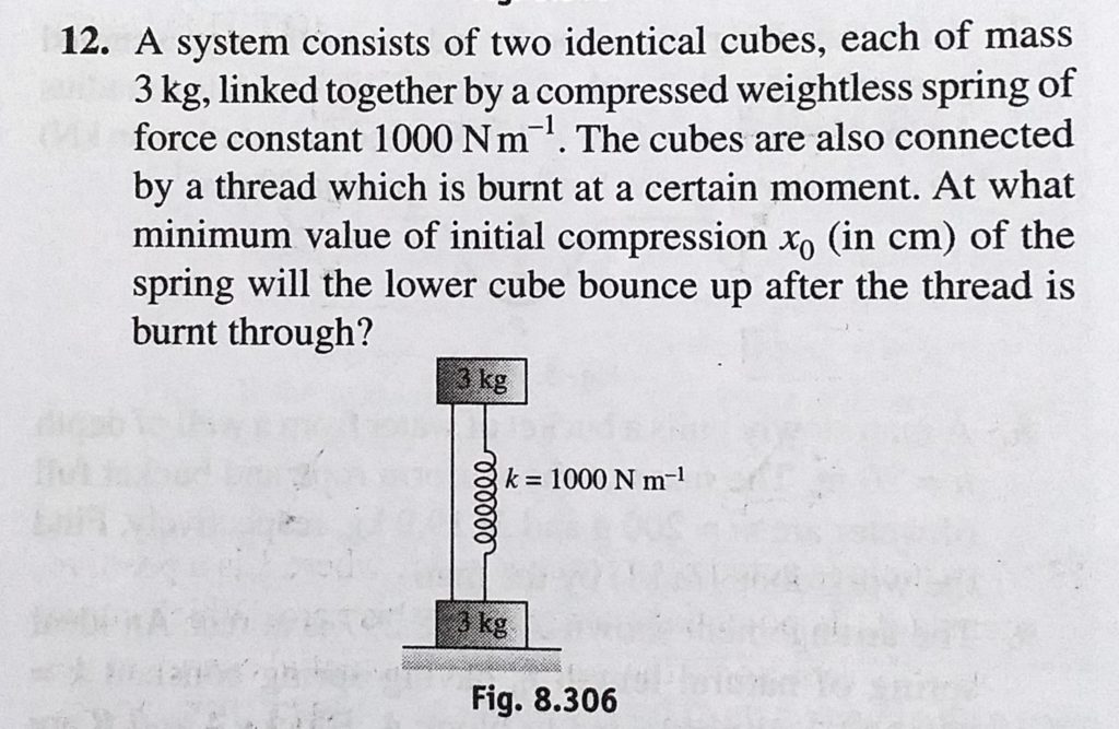 A system consists of two identical cubes, each of mass 3 kg, linked together by a compressed weightless spring of force constant 1000 N/m. The cubes are also connected by a thread A system consists of two identical cubes each of mass 3 kg linked together by a compressed weightless spring of force constant 1000 N/m. The cubes are also connected by a thread October 5, 2020 Category: Uncategorised (JEE Advanced Physics by BM Sharma + GMP Solutions) , Facebook Messenger WhatsApp Share this:TwitterFacebook Related