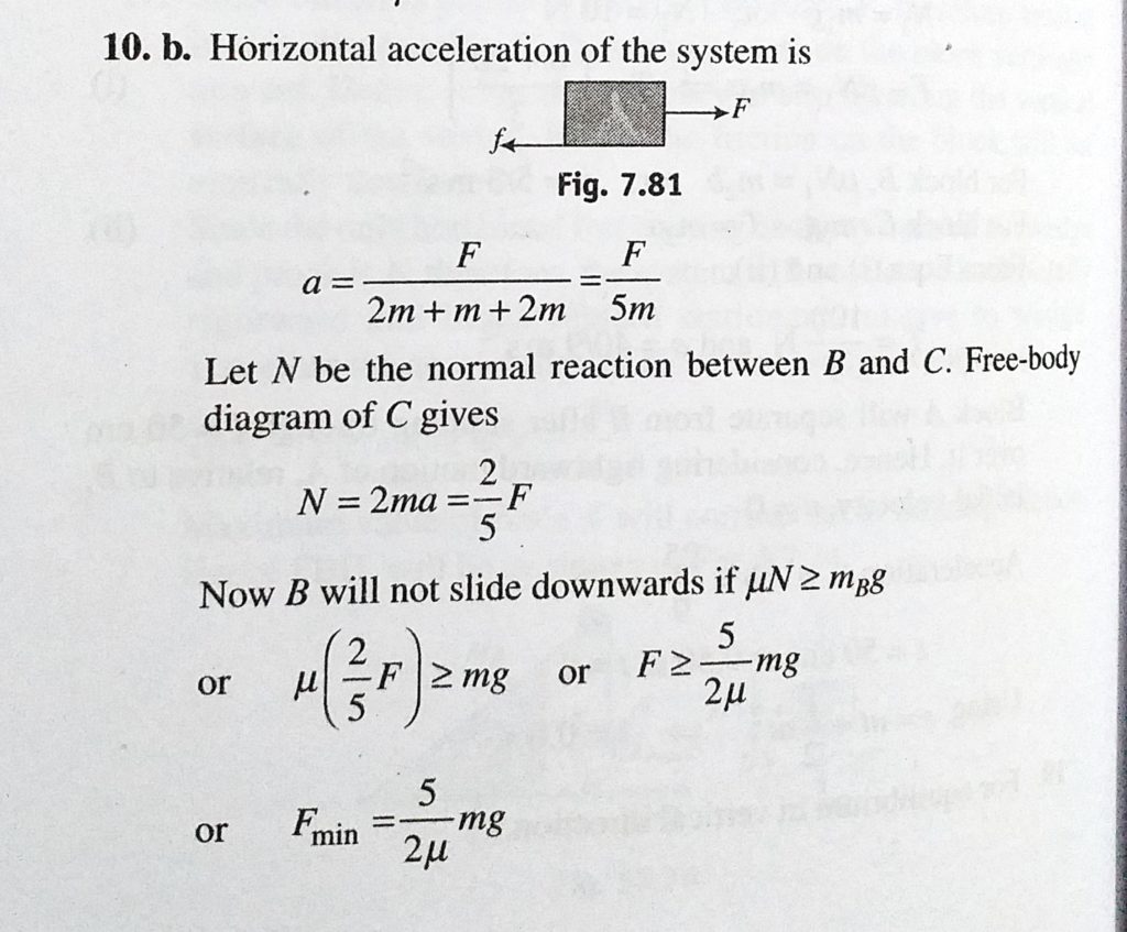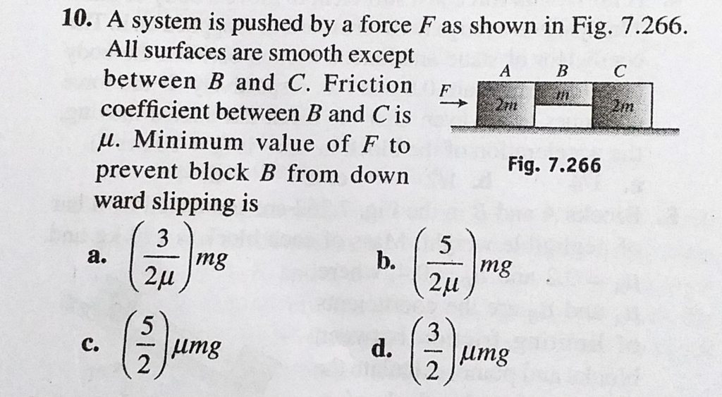 A system is pushed by a force F as shown in Fig. 7.266. All surfaces are smooth except between B and C. Friction coefficient between B and C is muon. Minimum value of F to prevent block A system is pushed by a force F as shown in Fig. 7.266. All surfaces are smooth except between B and C. Friction coefficient between B and C is muon. Minimum value of F to prevent block October 1, 2020 Category: Uncategorised (JEE Advanced Physics by BM Sharma + GMP Solutions) , Facebook Messenger WhatsApp Share this:TwitterFacebook Related