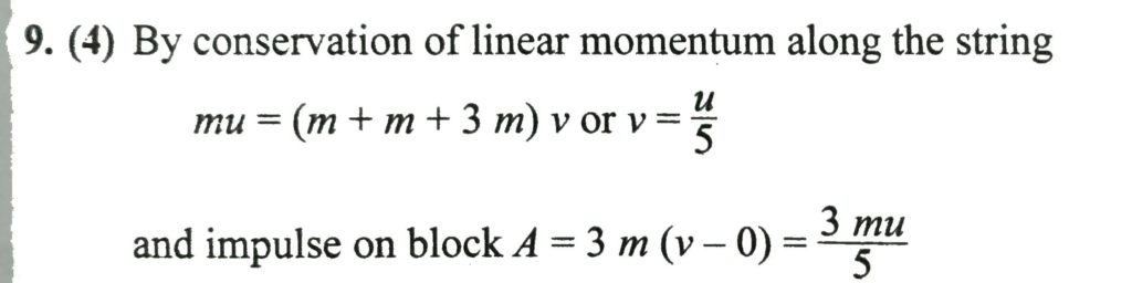A system of two blocks A and B are connected by an inextensible massless string as shown in figure. The pulley is massless and frictionless. Initially, the system is at rest. A bullet of mass ‘m’ moving with a velocity ‘u’ as shown hits block ‘B’ and gets embedded into it. The impulse imparted by tension force to the block of mass 3 m is