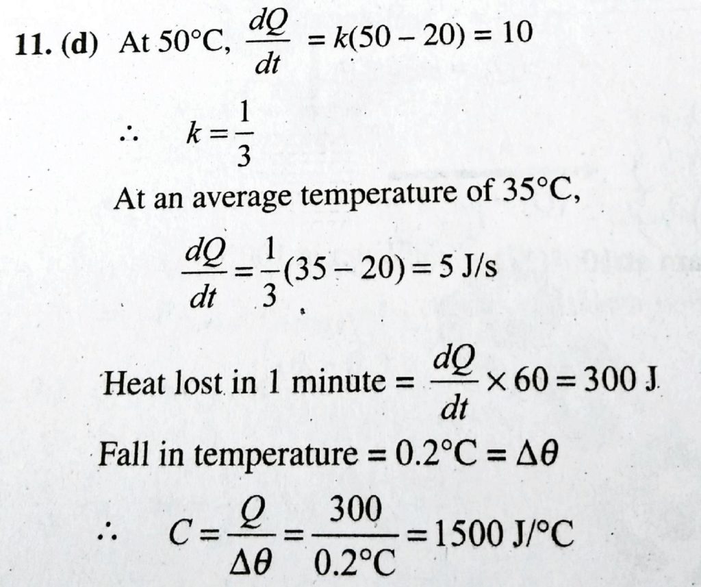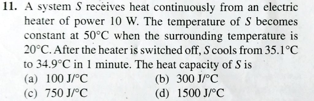 A system S receives heat continuously from an electric heater of power 10W. The temperature of S becomes constant at 50∘C when the surrounding temperature is 20∘C. After the heater is switched off, S cools from 35.1∘C to 34.9∘C in 1minute. the heat capacity of S is Question from Class 11 Chapter Thermal Properties Of Matter