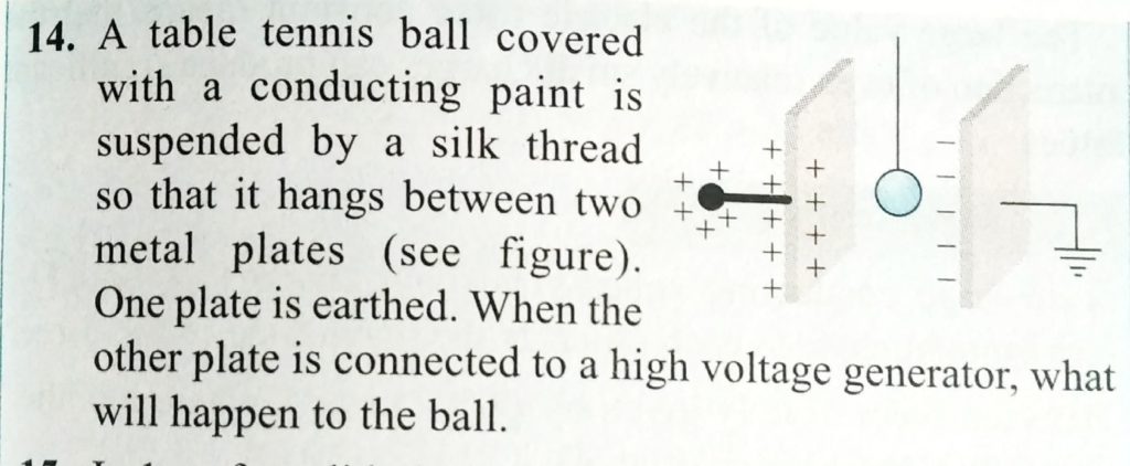 A table tennis ball covered with a conducting paint is suspended by a silk thread so that it hangs between tow metal plates. One plate is earthed, when the other plate is connected to a high voltage generator, what will happen to the ball. A table tennis ball covered with a conducting paint is suspended by a silk thread so that it hangs between tow metal plates. One plate is earthed what will happen to the ball. when the other plate is connected to a high voltage generator October 28, 2020 Category: Uncategorised (JEE Advanced Physics by BM Sharma + GMP Solutions) , Facebook Messenger WhatsApp Share this:TwitterFacebook Related