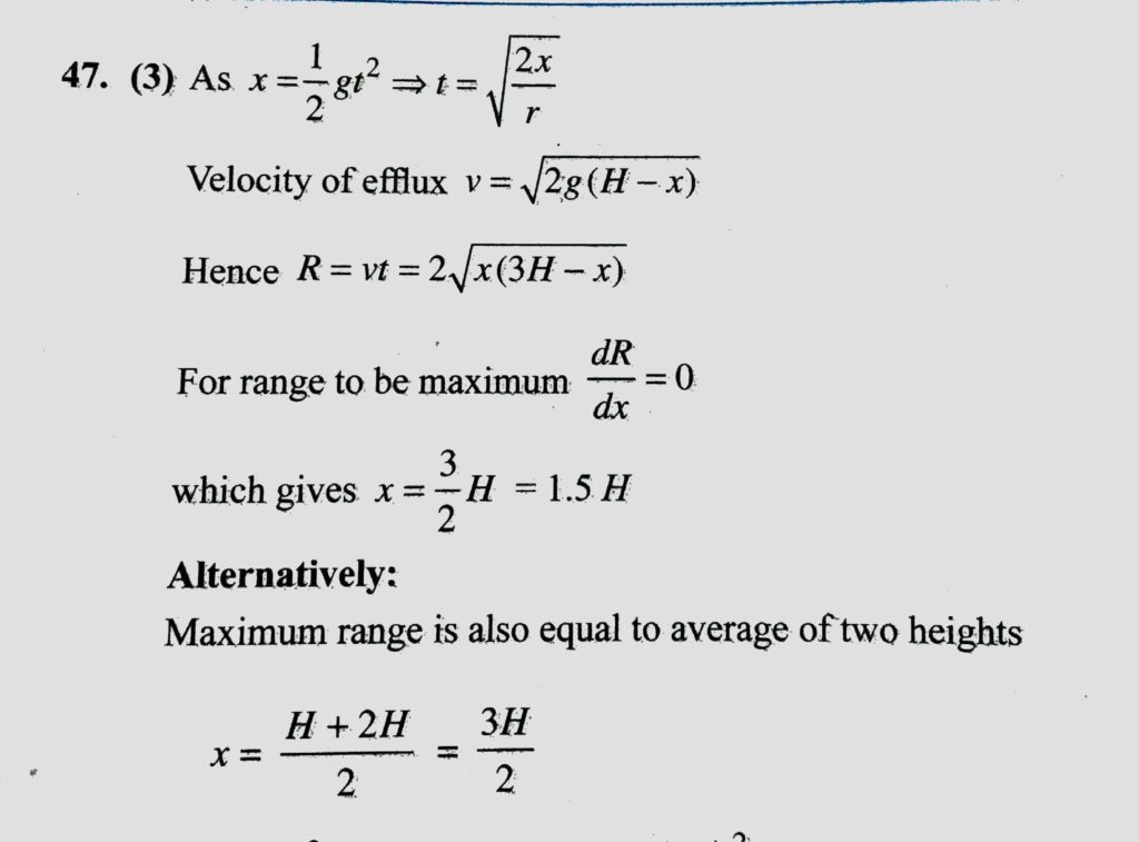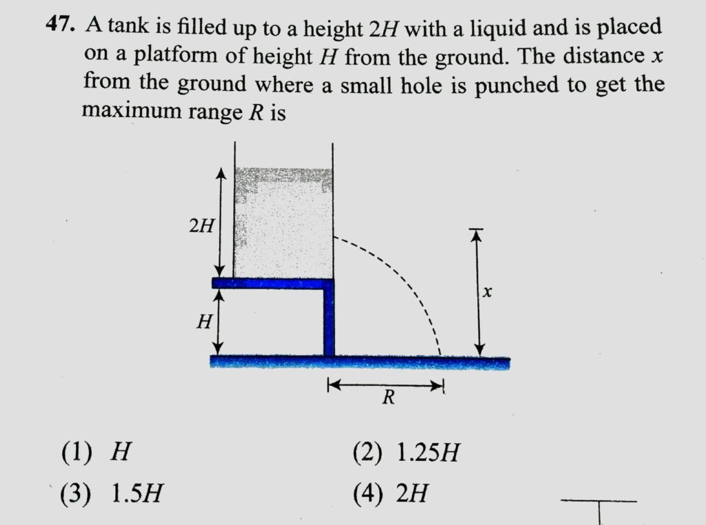 A tank is filled up to a height 2H with a liquid and is placed on a platform of height H from the ground, the distance x from the ground where a small hole is punched to get the maximum range R is A tank is filled up to a height 2H with a liquid and is placed on a platform of height H from the ground the distance x from the ground where a small hole is punched to get the maximum range R is October 7, 2020 Category: Uncategorised (JEE Advanced Physics by BM Sharma + GMP Solutions) , Facebook Messenger WhatsApp Share this:TwitterFacebook Related
