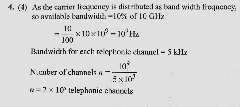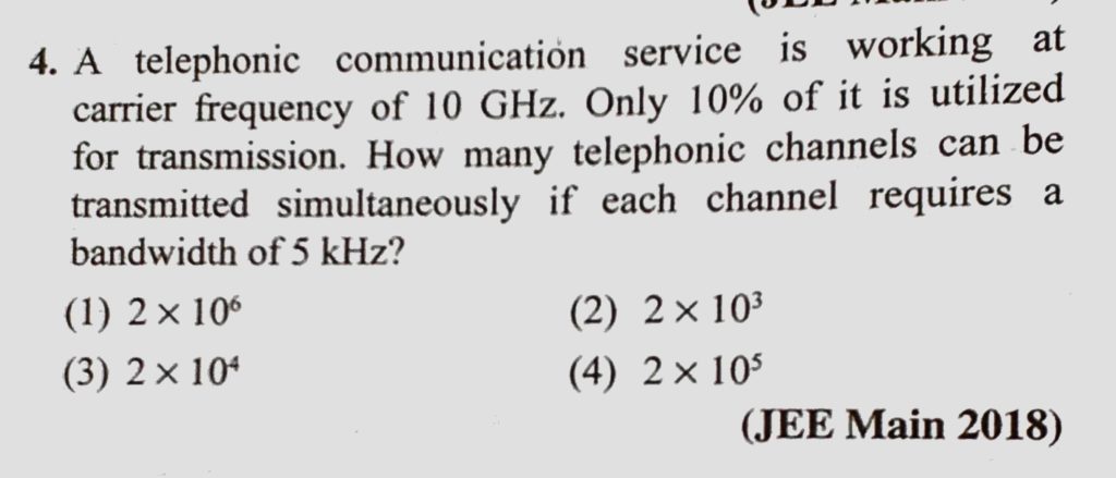 A telephonic communication service is working at carrier frequency of 10 GHz. Only 10% of it is utilized for transmission. How many telephonic channels can be transmitted simultaneously A telephonic communication service is working at carrier frequency of 10 GHz. Only 10% of it is utilized for transmission. How many telephonic channels can be transmitted simultaneously October 23, 2020 Category: Uncategorised (JEE Advanced Physics by BM Sharma + GMP Solutions) , Facebook Messenger WhatsApp Share this:TwitterFacebook Related