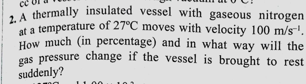 A thermally insulated vessel with gaseous nitrogen at a temperature of 27 C moves with velocity 100 m/s^-1. How much (in percentage) and in what way will the gas pressure A thermally insulated vessel with gaseous nitrogen at a temperature of 27 C moves with velocity 100 m/s^-1. How much (in percentage) and in what way will the gas pressure October 27, 2020 Category: Uncategorised (JEE Advanced Physics by BM Sharma + GMP Solutions) , Facebook Messenger WhatsApp Share this:TwitterFacebook Related