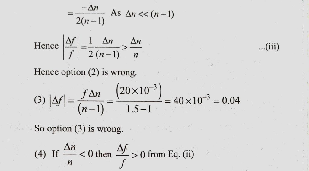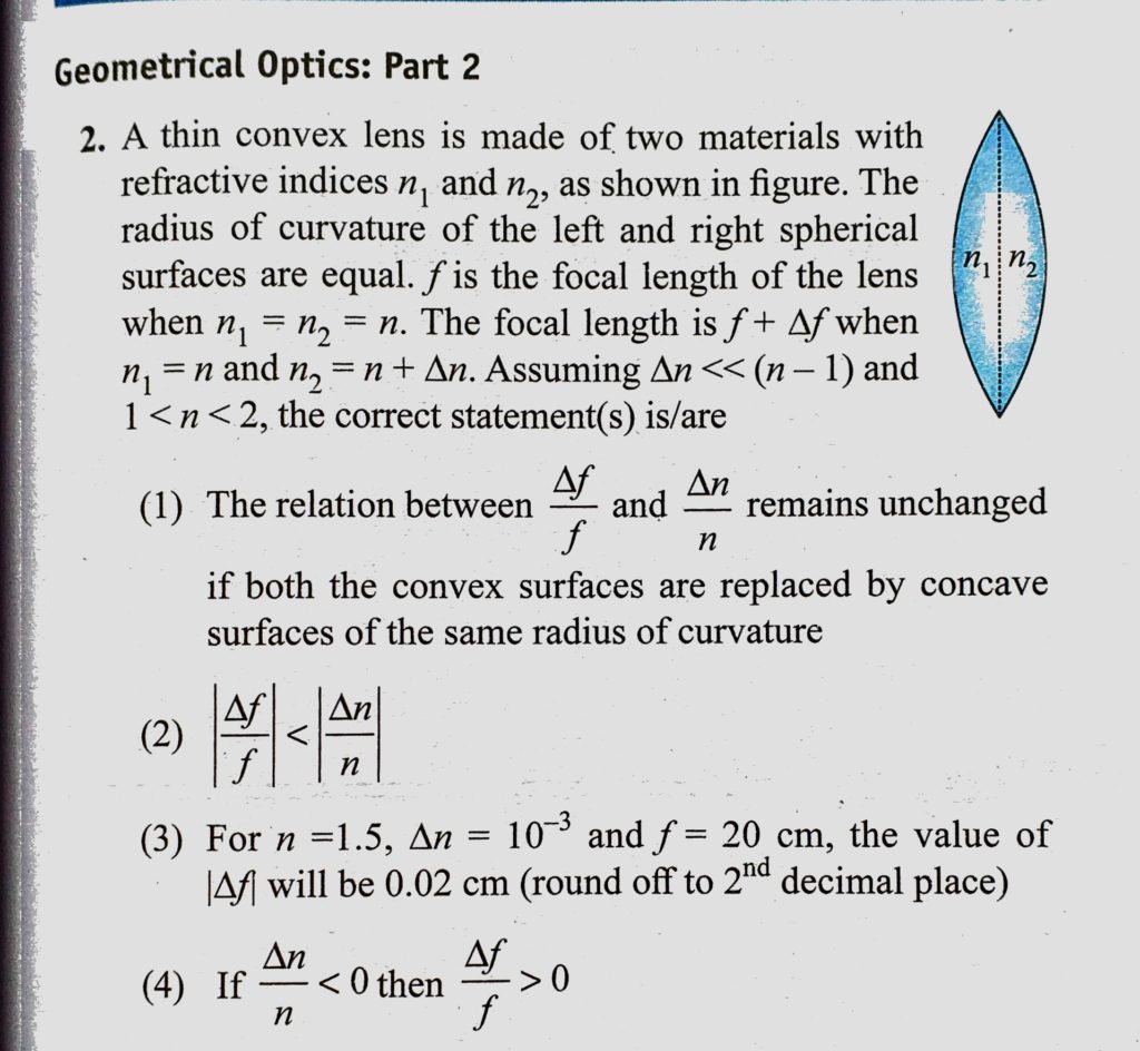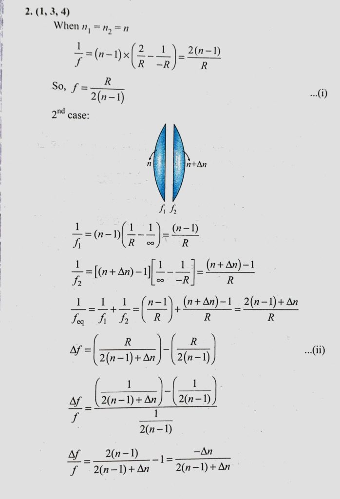 A thin convex lens is made of two materials with refractive indices n1 and n2 as shown in figure. The radius of curvature of the left and right spherical surfaces are equal. f is the focal length A thin convex lens is made of two materials with refractive indices n1 and n2 as shown in figure. The radius of curvature of the left and right spherical surfaces are equal. f is the focal length October 23, 2020 Category: Uncategorised (JEE Advanced Physics by BM Sharma + GMP Solutions) , Facebook Messenger WhatsApp Share this:TwitterFacebook Related