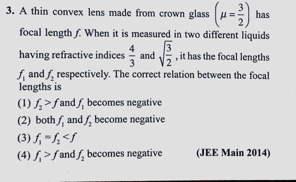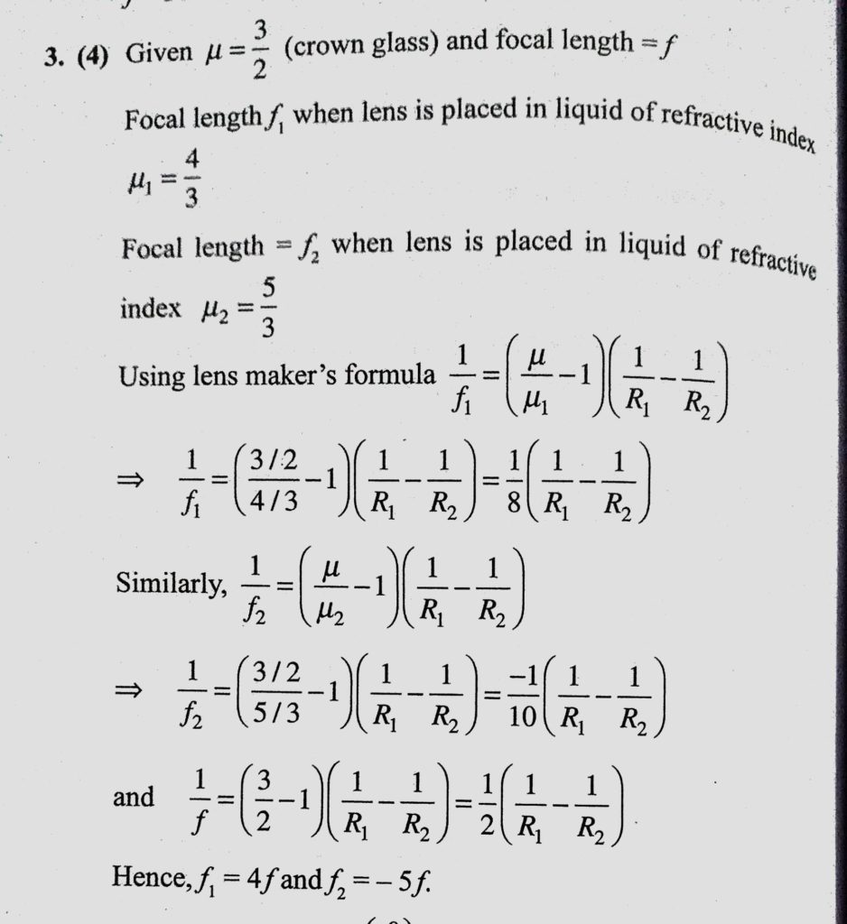 A thin convex lens made from crown glass ( mu = 3/2) has focal length f. When it is measured in two different liquids having refractive indices 4/3 and root 3/2, it has the focal lengths A thin convex lens made from crown glass ( mu = 3/2) has focal length f. When it is measured in two different liquids having refractive indices 4/3 and root 3/2 it has the focal lengths October 9, 2020 Category: Uncategorised (JEE Advanced Physics by BM Sharma + GMP Solutions) , Facebook Messenger WhatsApp Share this:TwitterFacebook Related