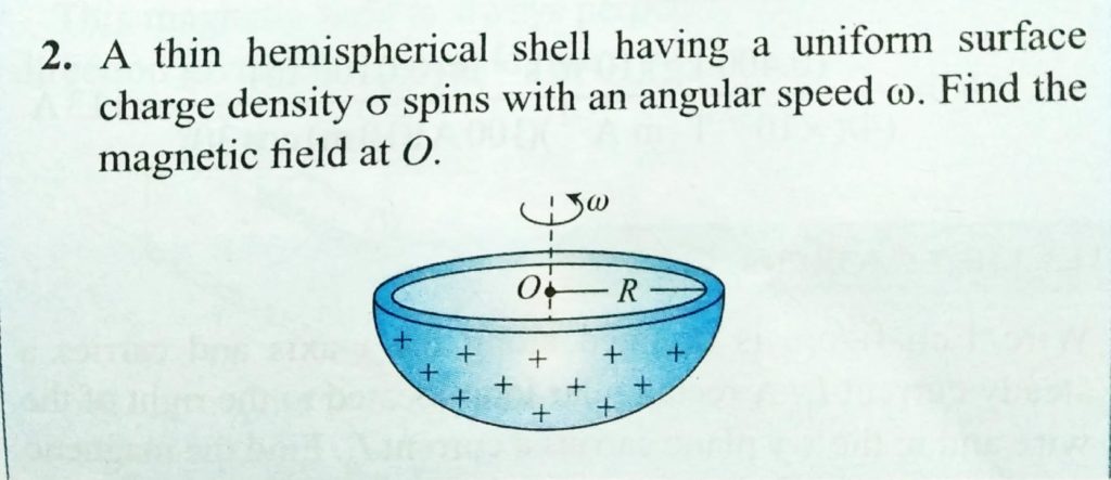 A thin hemispherical shell having uniform surface charge density sigma spins with an angular speed omega. Find the magnetic field at field at O. A thin hemispherical shell having uniform surface charge density sigma spins with an angular speed omega. Find the magnetic field at field at O. October 16, 2020 Category: Uncategorised (JEE Advanced Physics by BM Sharma + GMP Solutions) , Facebook Messenger WhatsApp Share this:TwitterFacebook Related