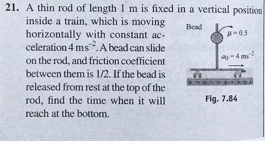 A thin rod of length 1 m is fixed in a vertical position inside a train, which is moving horizontally with constant acceleration 4 m/s^2. A bead can slide on the rod, and friction coefficient between A thin rod of length 1 m is fixed in a vertical position inside a train and friction coefficient between which is moving horizontally with constant acceleration 4 m/s^2. A bead can slide on the rod September 30, 2020 Category: Uncategorised (JEE Advanced Physics by BM Sharma + GMP Solutions) , Facebook Messenger WhatsApp Share this:TwitterFacebook Related