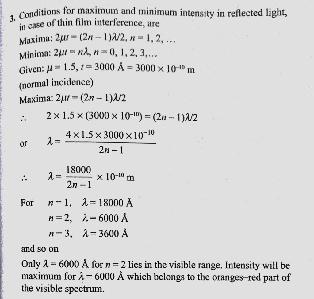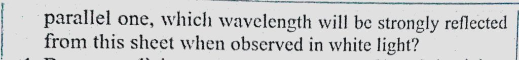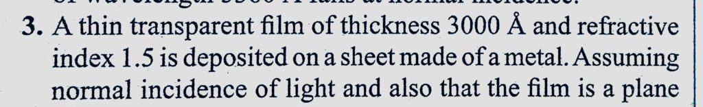 A thin transparent film of thickness 3000 A and refractive index 1.5 is deposited on a sheet made of a metal. Assuming normal incidence of light and also that the film is a plane A thin transparent film of thickness 3000 A and refractive index 1.5 is deposited on a sheet made of a metal. Assuming normal incidence of light and also that the film is a plane October 9, 2020 Category: Uncategorised (JEE Advanced Physics by BM Sharma + GMP Solutions) , Facebook Messenger WhatsApp Share this:TwitterFacebook Related