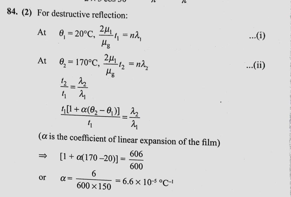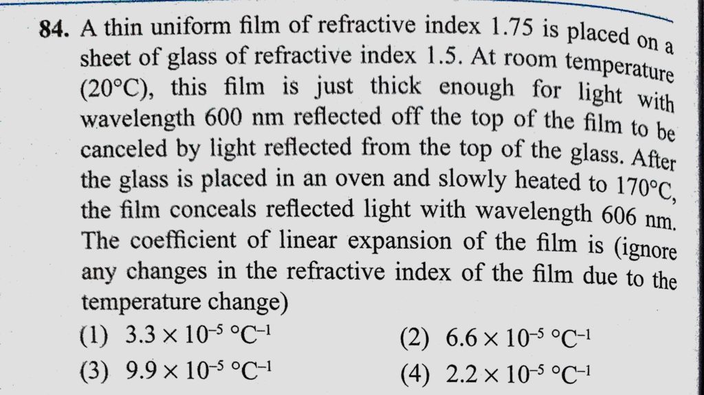 A thin uniform film of refractive index 1.75 is placed on a sheet of glass of refractive index 1.5. At room temperature (20 C), this film is just thick enough for light with wavelength 600nm A thin uniform film of refractive index 1.75 is placed on a sheet of glass of refractive index 1.5. At room temperature (20 C) this film is just thick enough for light with wavelength 600nm October 10, 2020 Category: Uncategorised (JEE Advanced Physics by BM Sharma + GMP Solutions) , Facebook Messenger WhatsApp Share this:TwitterFacebook Related