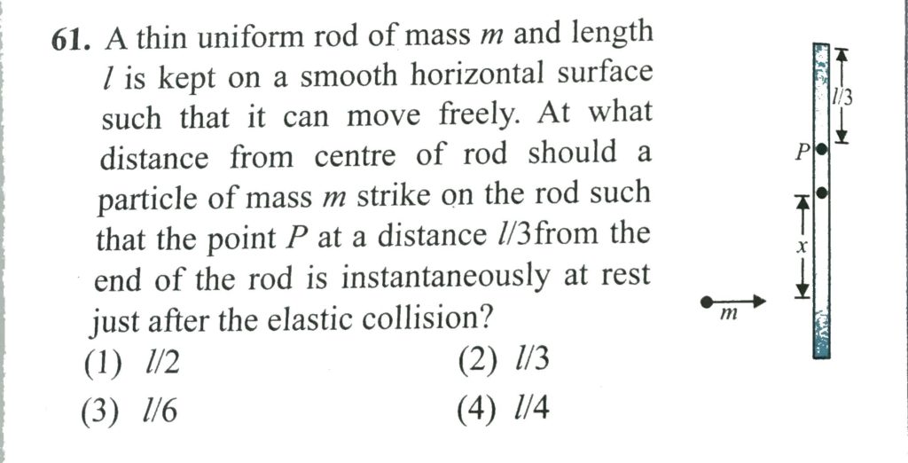 A thin uniform rod of mass m and length l is kept on a smooth horizontal surface such that it can move freely. At what distance from centre of rod should a particle of mass m strike on the rod such that the point P at a distance l3 from the end of the rod is instantaneously at rest just after the elastic collision?