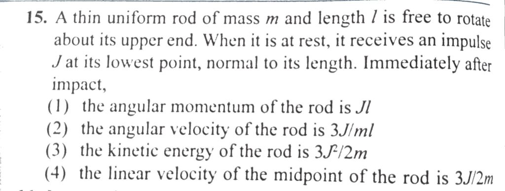 A thin uniform rod of mass m and length l is free to rotate about its upper end. When it is at rest, it receives an impulse J at its lowest point, normal to its length. Immediately after impact: A thin uniform rod of mass m and length l is free to rotate about its upper end. When it is at rest it receives an impulse J at its lowest point normal to its length. Immediately after impact: September 30, 2020 Category: Uncategorised (JEE Advanced Physics by BM Sharma + GMP Solutions) , Facebook Messenger WhatsApp Share this:TwitterFacebook Related