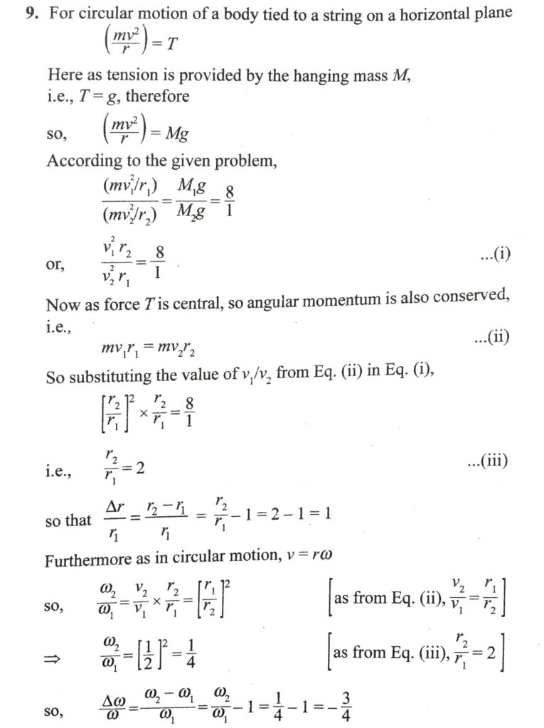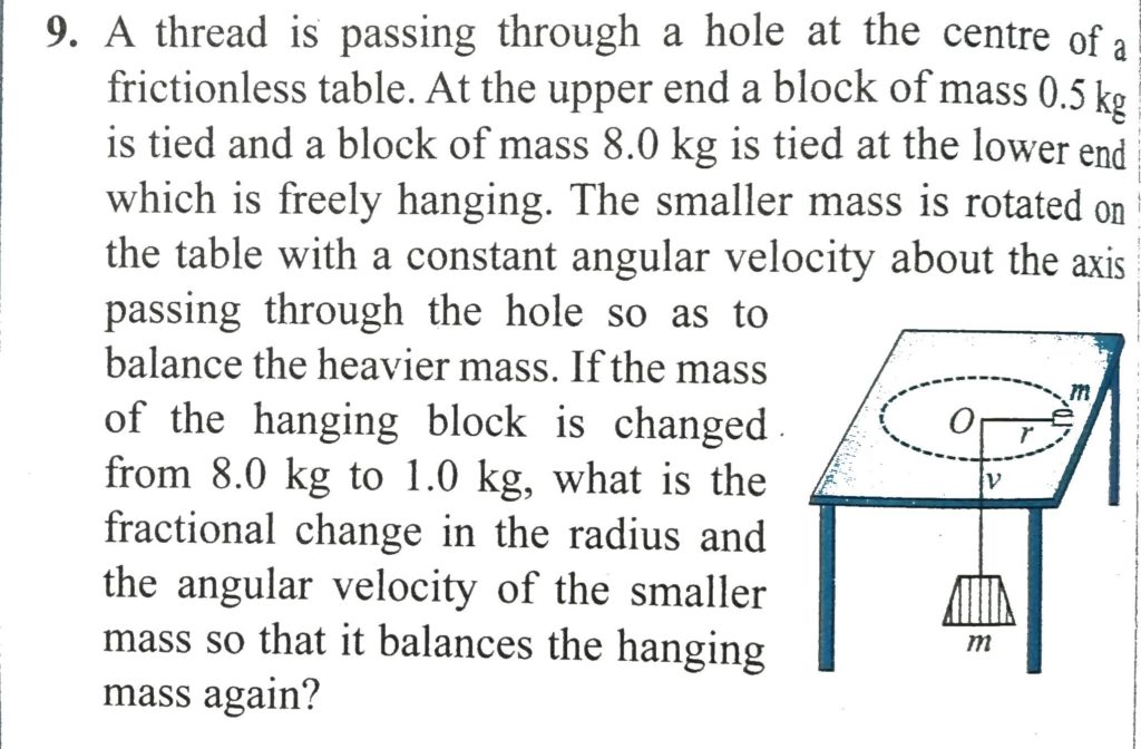 A thread is passing through a hole at the centre of frictionless table. At the upper end a block of mass 0.5kg is tied and a block of mass 8.0kg is tied at the lower end which is freely hanging. The smaller mass is rotate, on the table with a constant angular velocity about the axis passing through the hole so as to balance the heavier mass. If the mass of the hanging block is changed from 8.0kg to 1.0kg, what is the fractional change in the radius and the angular velocity of the smaller mass so that it balances the hanging mass again?