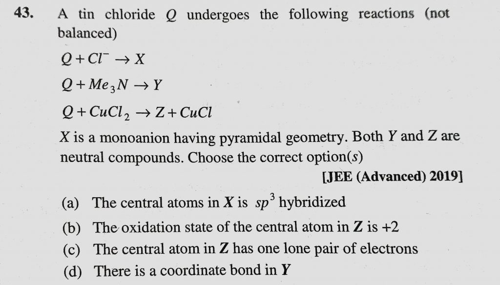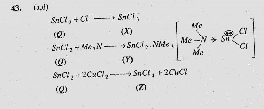 A tin chloride Q undergoes the following reactions (not balanced) Q + Cl – to X Q + Me2N to Y Q + CuCl2 to Z + CuCl X is a monoanion having pyramidal geometry. Both Y and Z are neutral compounds. Choose the correct option(s) Which of the following is/are V-shaped molecule (s) (a) SnCl2 (b) SnCl4 (c) COS (d) PbCl2 November 29, 2020 Category: Uncategorised (JEE Advanced Physics by BM Sharma + GMP Solutions) , Facebook Messenger WhatsApp Share this:TwitterFacebook Related