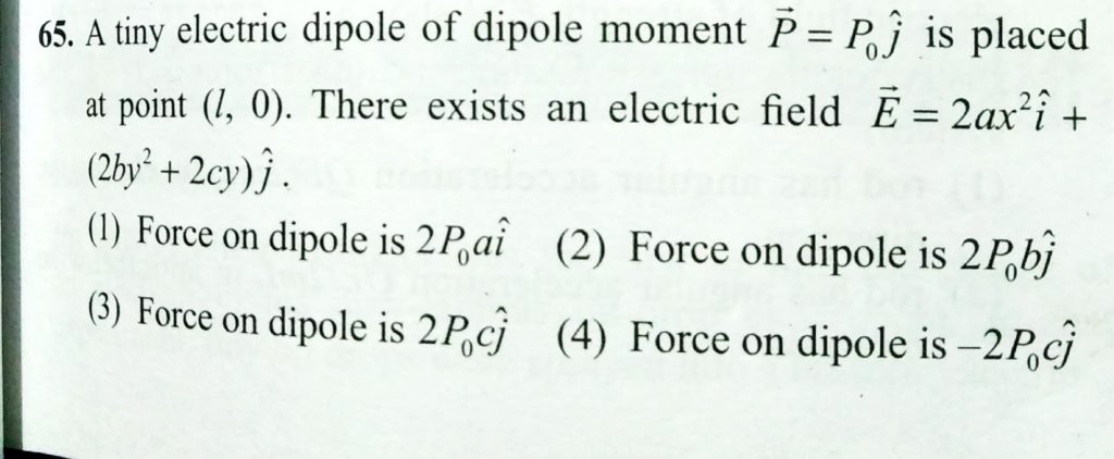 A tiny electric dipole of dipole moment p = p0j is placed at a point ( 1 , 0 ). There exists an electric field e = 2ax^2 i + ( 2 by^2 + 2 cy ) a tiny electric dipole of dipole moment p = p0j is placed at a point ( 1 , 0 ). There exists an electric field e = 2ax^2 i + ( 2 by^2 + 2 cy )