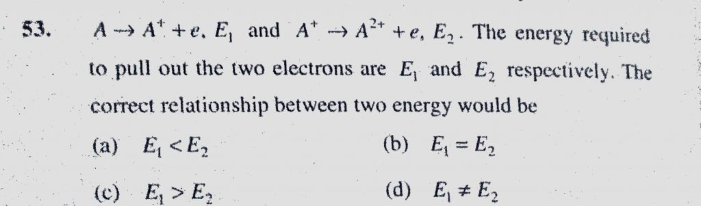 A to A+ + e. E1 and A+ to A 2+ + e, E2. The energy required to pull out the two electrons are E1 and E2 respectively. The correct relationship between two energy would be A to A+ + e. E1 and A+ to A 2+ + e E2. The energy required to pull out the two electrons are E1 and E2 respectively. The correct relationship between two energy would be November 9, 2020 Category: Uncategorised (JEE Advanced Physics by BM Sharma + GMP Solutions) , Facebook Messenger WhatsApp Share this:TwitterFacebook Related