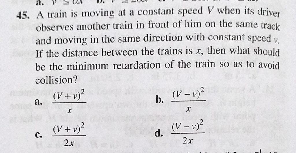 A train is moving at a constant speed V when its driver observes another train in front of him on the same track and moving in the same direction with constant speed v. If the distance between the A train is moving at a constant speed V when its driver observes another train in front of him on the same track and moving in the same direction with constant speed v. If the distance between the September 19, 2020 Category: Uncategorised (JEE Advanced Physics by BM Sharma + GMP Solutions) , Facebook Messenger WhatsApp Share this:TwitterFacebook Related