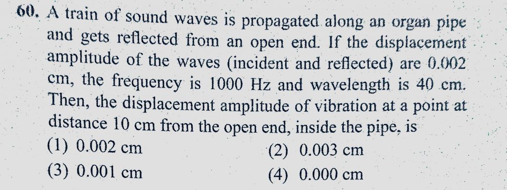 A train of sound waves is propagated along an organ pipe and gets reflected from an open end. If the displacement amplitude of the waves (incident and reflected) are 0.002 cm, A train of sound waves is propagated along an organ pipe and gets reflected from an open end. If the displacement amplitude of the waves (incident and reflected) are 0.002 cm November 6, 2020 Category: Uncategorised (JEE Advanced Physics by BM Sharma + GMP Solutions) , Facebook Messenger WhatsApp Share this:TwitterFacebook Related
