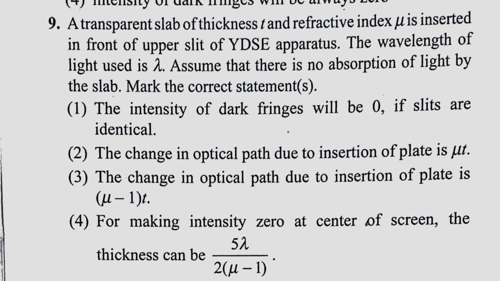 A transparent slab of thickness t and refractive index mu is inserted in front of upper slit of YDSE apparatus. The wavelength of light used is lemda. Assume that there is no absorption of A transparent slab of thickness t and refractive index mu is inserted in front of upper slit of YDSE apparatus. The wavelength of light used is lemda. Assume that there is no absorption of October 11, 2020 Category: Uncategorised (JEE Advanced Physics by BM Sharma + GMP Solutions) , Facebook Messenger WhatsApp Share this:TwitterFacebook Related