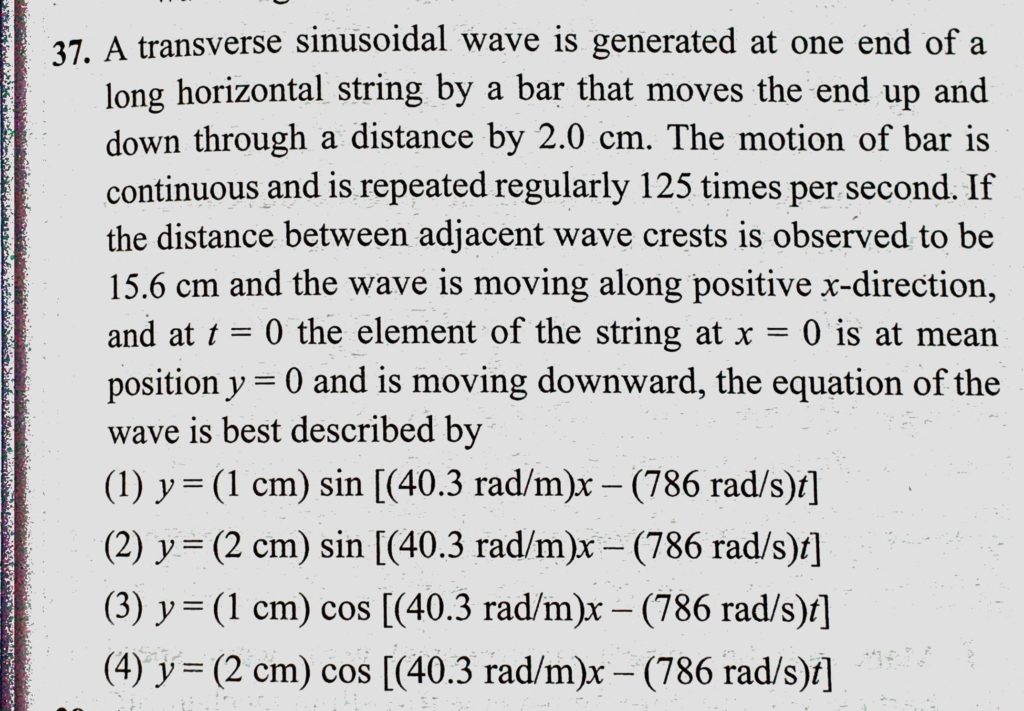 A transverse sinusoidal wave is generated at one end of a long horizontal string by a bar that moves the end up and down through a distance by 2.0 cm. The motion of bar is A transverse sinusoidal wave is generated at one end of a long horizontal string by a bar that moves the end up and down through a distance by 2.0 cm. The motion of bar is November 1, 2020 Category: Uncategorised (JEE Advanced Physics by BM Sharma + GMP Solutions) , Facebook Messenger WhatsApp Share this:TwitterFacebook Related