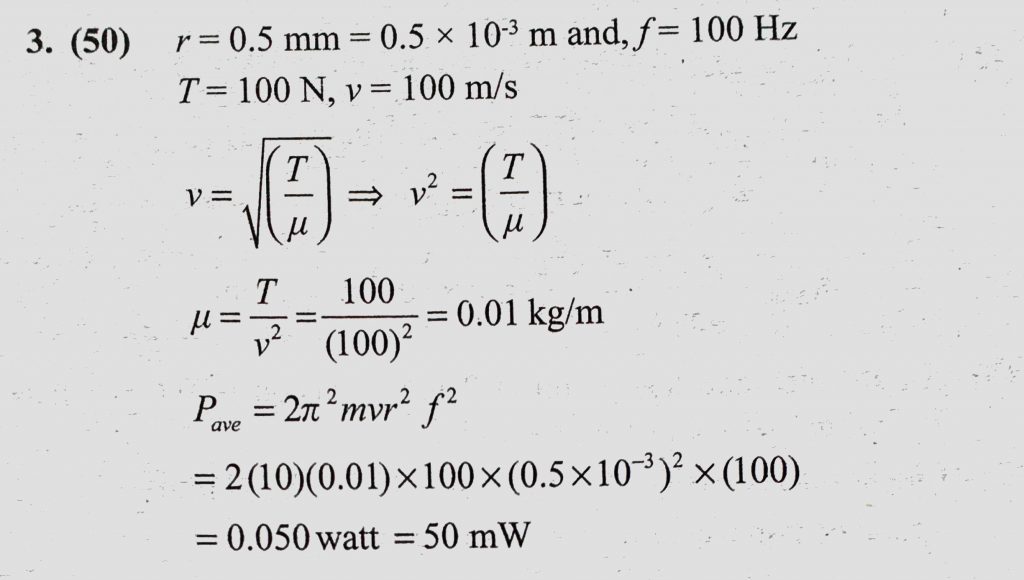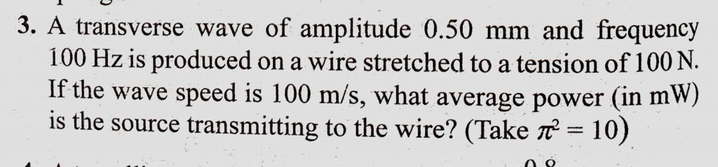 A transverse wave of amplitude 0.50 mm and frequency 100 Hz is produced on a wire stretched to a tension of 100 N. If the wave speed is 100 m/s, what average power ( in mW) A transverse wave of amplitude 0.50 mm and frequency 100 Hz is produced on a wire stretched to a tension of 100 N. If the wave speed is 100 m/s what average power ( in mW) November 5, 2020 Category: Uncategorised (JEE Advanced Physics by BM Sharma + GMP Solutions) , Facebook Messenger WhatsApp Share this:TwitterFacebook Related