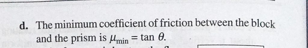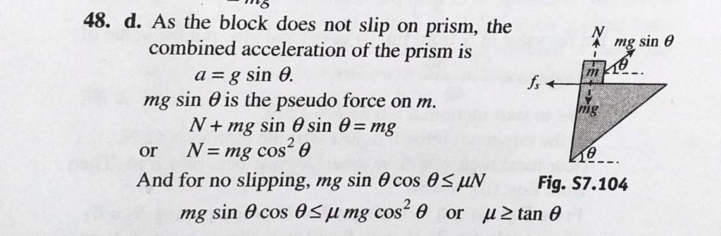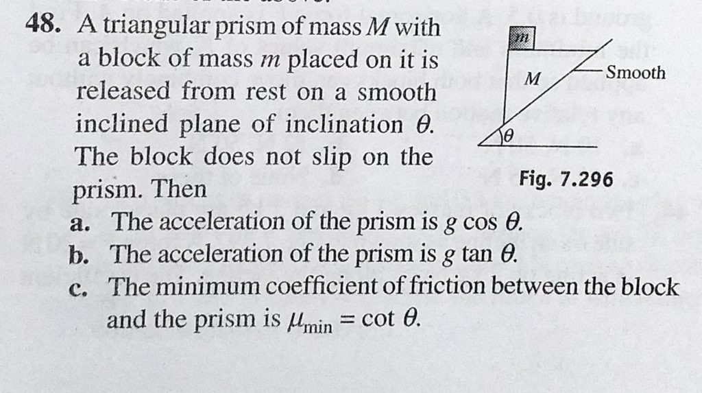 A triangular prism of mass M with a block of mass m placed on it is released from rest on a smooth inclined plane of inclination theta. The block does not slip on the prism . Then A triangular prism of mass M with a block of mass m placed on it is released from rest on a smooth inclined plane of inclination theta. The block does not slip on the prism . Then October 1, 2020 Category: Uncategorised (JEE Advanced Physics by BM Sharma + GMP Solutions) , Facebook Messenger WhatsApp Share this:TwitterFacebook Related