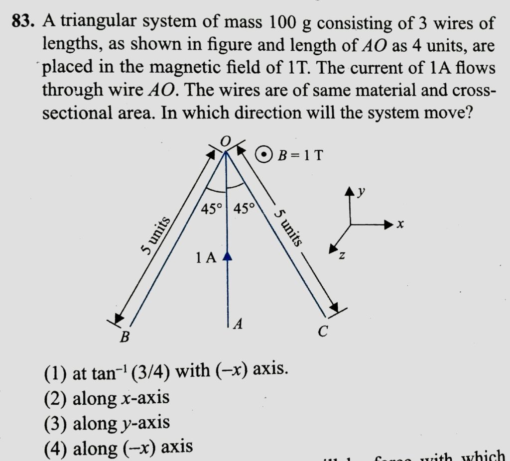 A triangular system of mass 100 g consisting of 3 wires of length , as shown in figure and length of AO as 4 units , are placced in the magnetic field of 1 T. Th ecurrent of 1A flows through wire AO. The wires are of same material and cross sectional area. In which direction will the system move ?