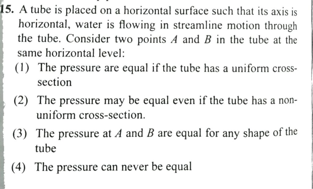 A Tube is placed on a horizontal surfa ce such that its axis is horizontal , watert is flowing in streamline motion through the tube. Consider two points A nad B in the tube at the same horizontal level: A Tube is placed on a horizontal surfa ce such that its axis is horizontal watert is flowing in streamline motion through the tube. Consider two points A nad B in the tube at the same horizontal level: October 8, 2020 Category: Uncategorised (JEE Advanced Physics by BM Sharma + GMP Solutions) , Facebook Messenger WhatsApp Share this:TwitterFacebook Related