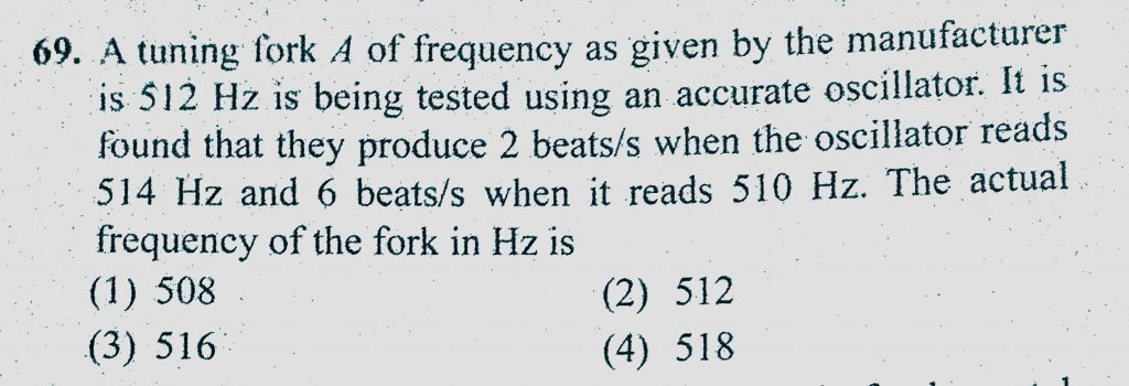 A tuning fork A of frequency as given by the manufacturer is 512 Hz is being tested using an accurate oscillator. It is found that they produce 2 beats/s when the oscillator reads A tuning fork A of frequency as given by the manufacturer is 512 Hz is being tested using an accurate oscillator. It is found that they produce 2 beats/s when the oscillator reads November 6, 2020 Category: Uncategorised (JEE Advanced Physics by BM Sharma + GMP Solutions) , Facebook Messenger WhatsApp Share this:TwitterFacebook Related