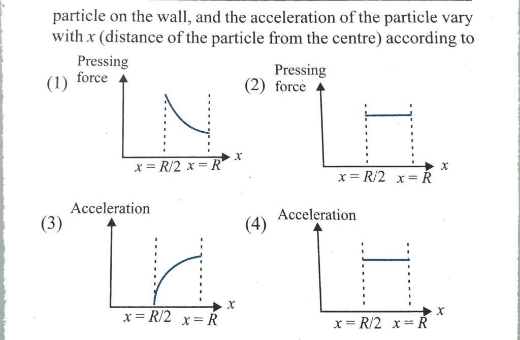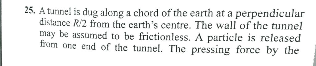 A tunnel is dug along a chord of the earth at a perpendicular distance R/2 from the earth’s centre. The wall of the tunnel may be assumed to be frictionless. A particle is released from one end of the tunnel. The pressing force by the particle on the wall, and the acceleration of the particle vary with x (distance of the particle from the centre) according to