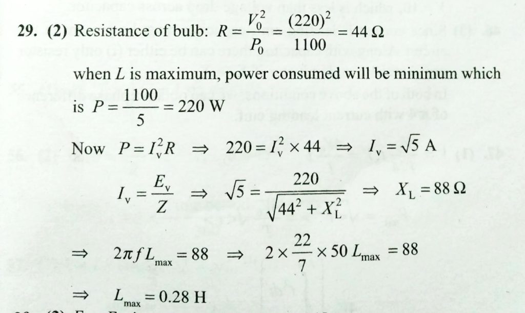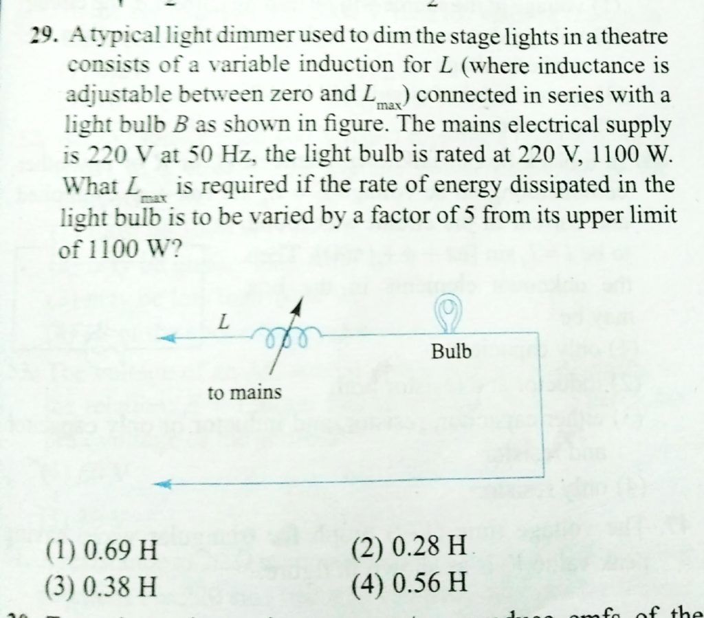 A typical light dimmer used to dim the stage lights in a theater consists of a variable inductor L (whose inductance is adjustable between zero and L max ) connected in series with a light bulb B, as shown in above figure. The electrical supply is 120 V (rms) at 60.0 Hz; the light bulb is rated at 120 V, 1000 W.