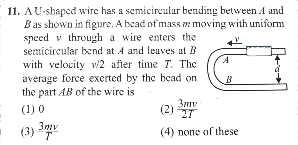 A U-shaped smooth wire has a semi-circular bending between A and B as shown in fig. A bead of mass m moving with uniform speed v through the wire enters the semiculcular bent at A and leaves at B. Find the average force exerted by the bead on the part AB of the wire.