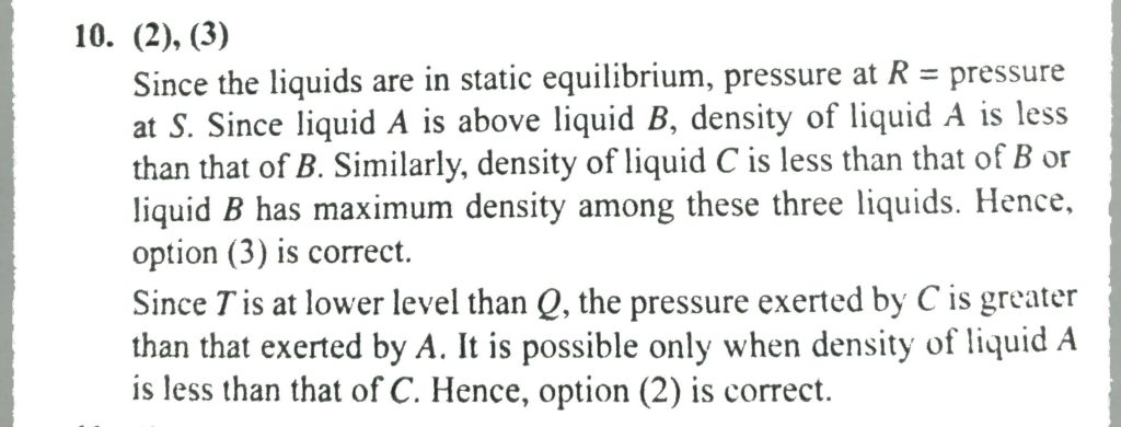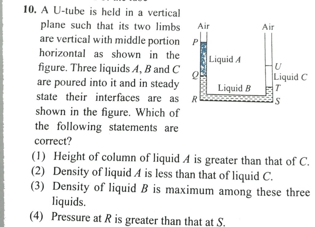 A U-tube is held in a vertical plane such that its two limbs are vertical with middle portion horizontal as shown in the figure. Three liquids A, B and C are poured into it and in steady state their interfaces are as shown in the figure. Which of the following statements are correct?