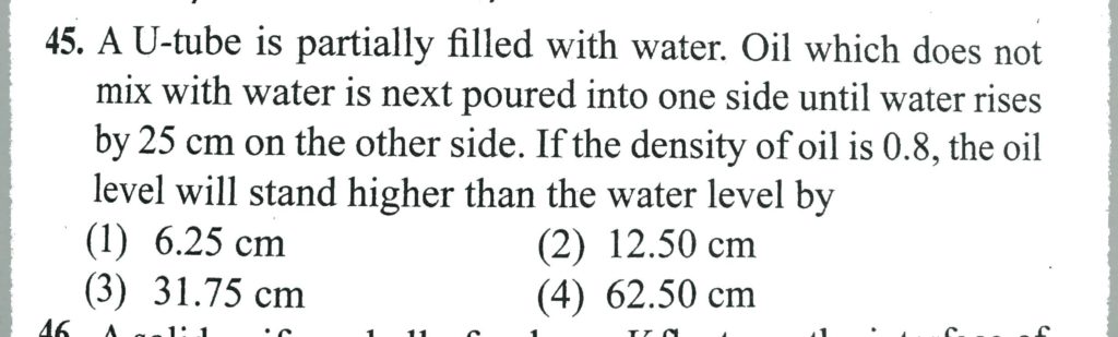 A U-tube is partially filled with water. Oil which does not mix with water is next poured into one side, until water rises by 25 cm on the other side. If the density of oil 0.8 g/cm^3. The oil level will stand higher than the water by A U-tube is partially filled with water. Oil which does not mix with water is next poured into one side until water rises by 25 cm on the other side. If the density of oil 0.8 g/cm^3. The oil level will stand higher than the water by October 7, 2020 Category: Uncategorised (JEE Advanced Physics by BM Sharma + GMP Solutions) , Facebook Messenger WhatsApp Share this:TwitterFacebook Related
