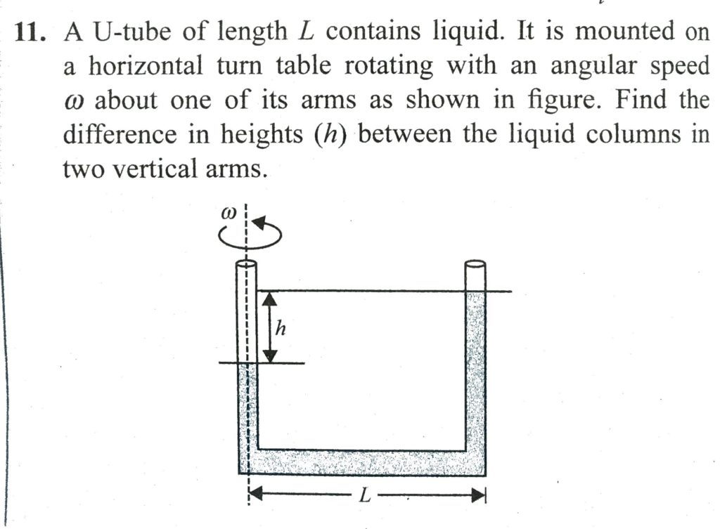 A U-tube of length ℓ contains a liquid. It is mounted on a horizontal turntable rotating with an angular speed ω about one of the arms. The difference in heights between the liquid columns in the vertical arm will be A cylinder of radius R = 1 m and height H = 3 m two- thirds filled with water is rotated about its vertical axis as shown in Fig. Determine the speed of rotation when a. the: water just starts spilling over the rim. b. the point at the centre of the base is just exposed. October 6, 2020 Category: Uncategorised (JEE Advanced Physics by BM Sharma + GMP Solutions) , Facebook Messenger WhatsApp Share this:TwitterFacebook Related