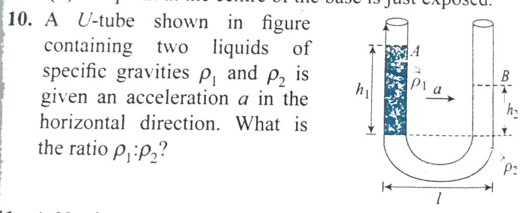 A u – tube shown in figure containing two liquids of specific gravities rho 1 and rgho2 is given an acceleration a in the horizontal direction . What is the ratio rho1 : rho 2? A u - tube shown in figure containing two liquids of specific gravities rho 1 and rgho2 is given an acceleration a in the horizontal direction . What is the ratio rho1 : rho 2? October 6, 2020 Category: Uncategorised (JEE Advanced Physics by BM Sharma + GMP Solutions) , Facebook Messenger WhatsApp Share this:TwitterFacebook Related
