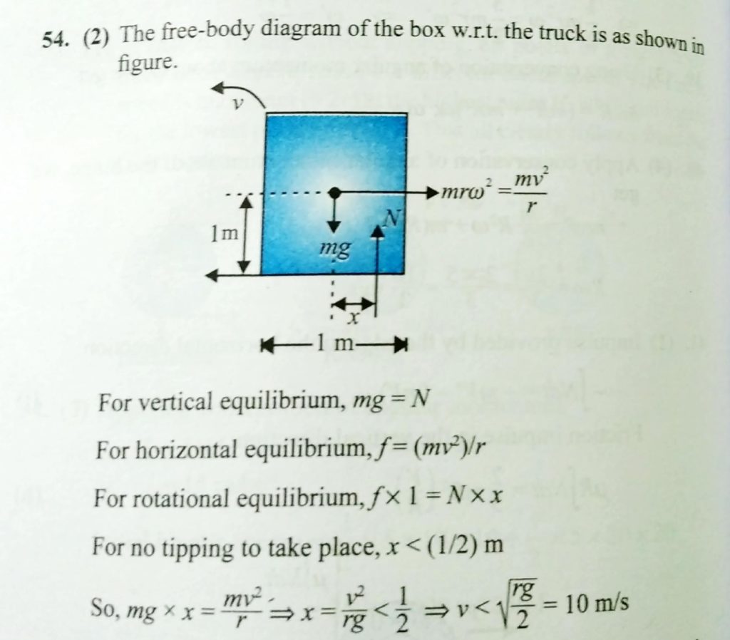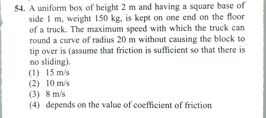 A uniform box of height 2 m and having a square base of side 1 m, weight 150 kg, is kept on one end on the floor of a truck. The maximum speed with which the truck can round a curve of radius 20 m without causing the block to tip over is (assume that friction is sufficient is no sliding).
